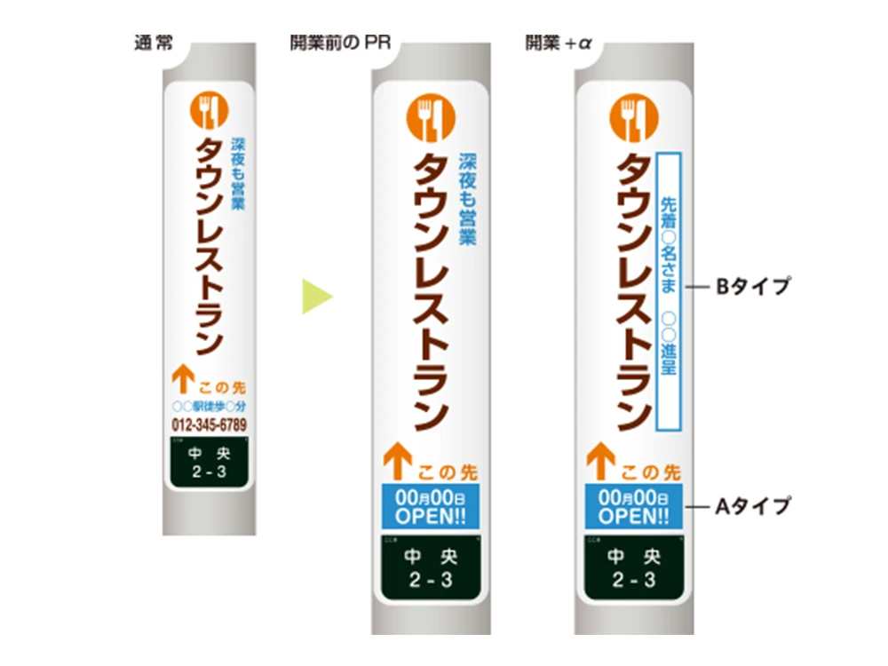 地面に直接設置する、または埋め込むタイプの看板のことを自立看板といいます。 店舗入口付近にL字型、A字型看板や、街のインフォメーションとしてよく見かける二本足タイプ、タワーサイン、ポール型のポールサインなど。自立看板は遠目からも通行人の目に留まりやすい為、宣伝効果、集客効果を期待でき、店舗への誘導に効果的です。